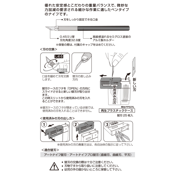 切りやすさにこだわった重量設計で、細かな作業で求められる微妙な力加減の調整がしやすいペンタイプナイフです。刃は口金によりしっかりと固定されるため、刃がグラつかず快適に作業を進められます。
